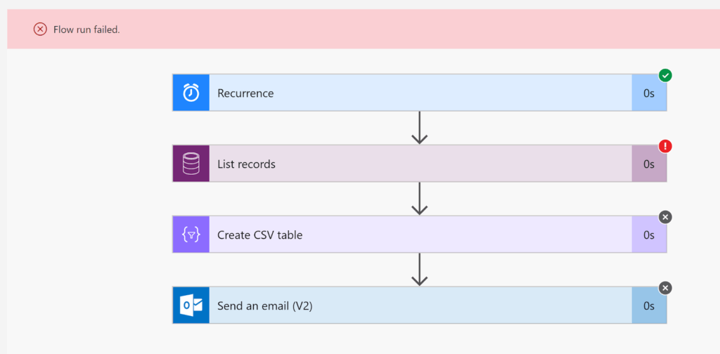To do that I deleted all the “failed” and “waiting” resource system jobs from the instance I was checking. My Flow failed because it couldn’t generate and attach the CSV file, which is probably better than receiving email alerts on failures if there are no stalled workflows.