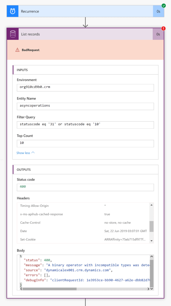 As an example I’ve put single quotes for options set values ‘10’ instead of 10. This leads to flow failure, but instead of a long process of analysis and debugging, it only took a minute to see the response from D365 API and then Google the issue.