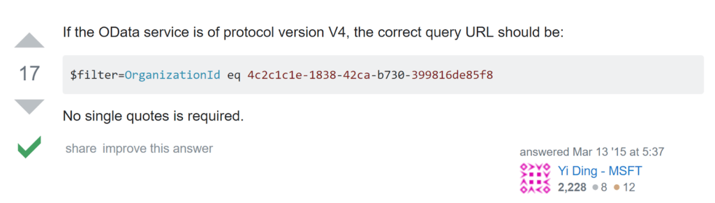 The very first result gives the solution - ODATA V4 does not require single quote for its parameters.