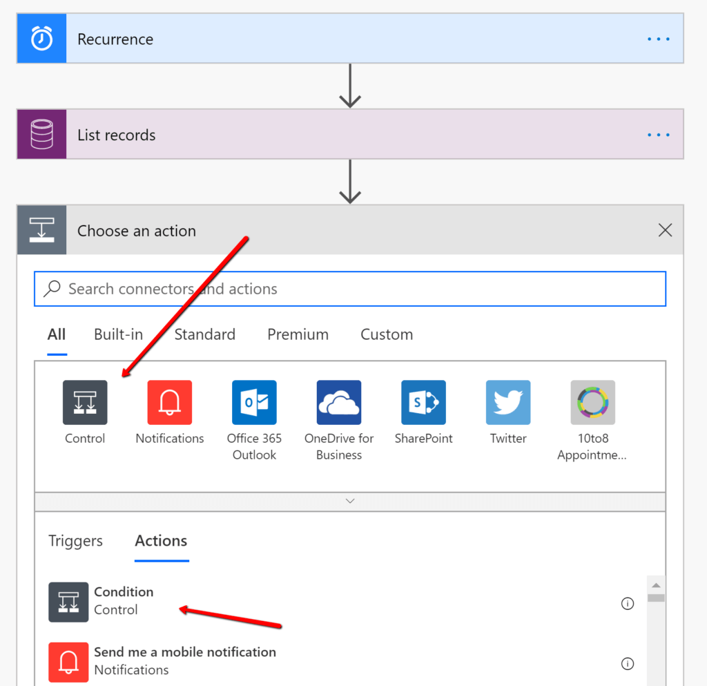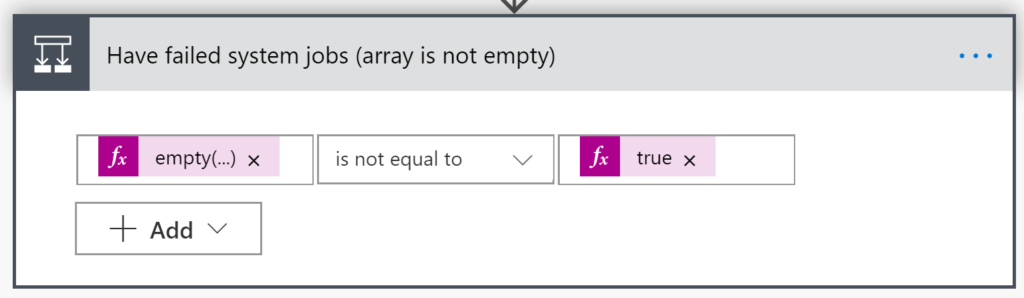 I then added a condition check after retrieving a list of system jobs. To do this, all you have to do is type “condition” or “control” into the filter box.