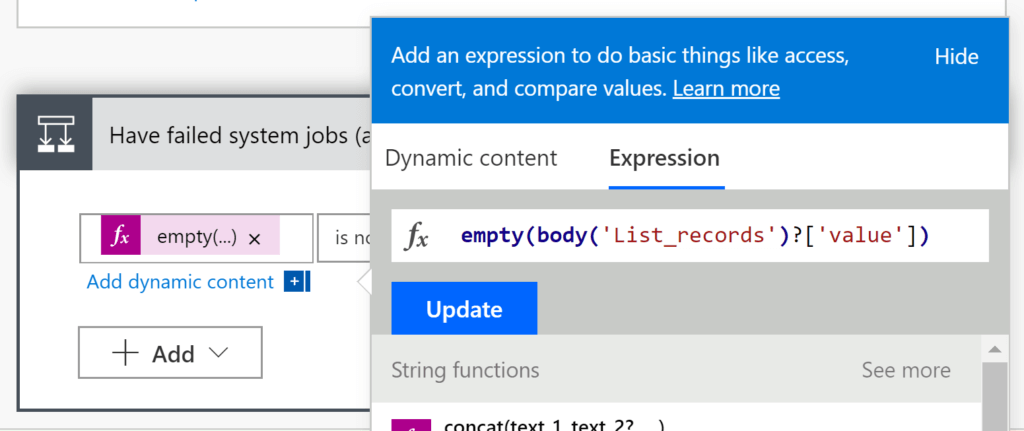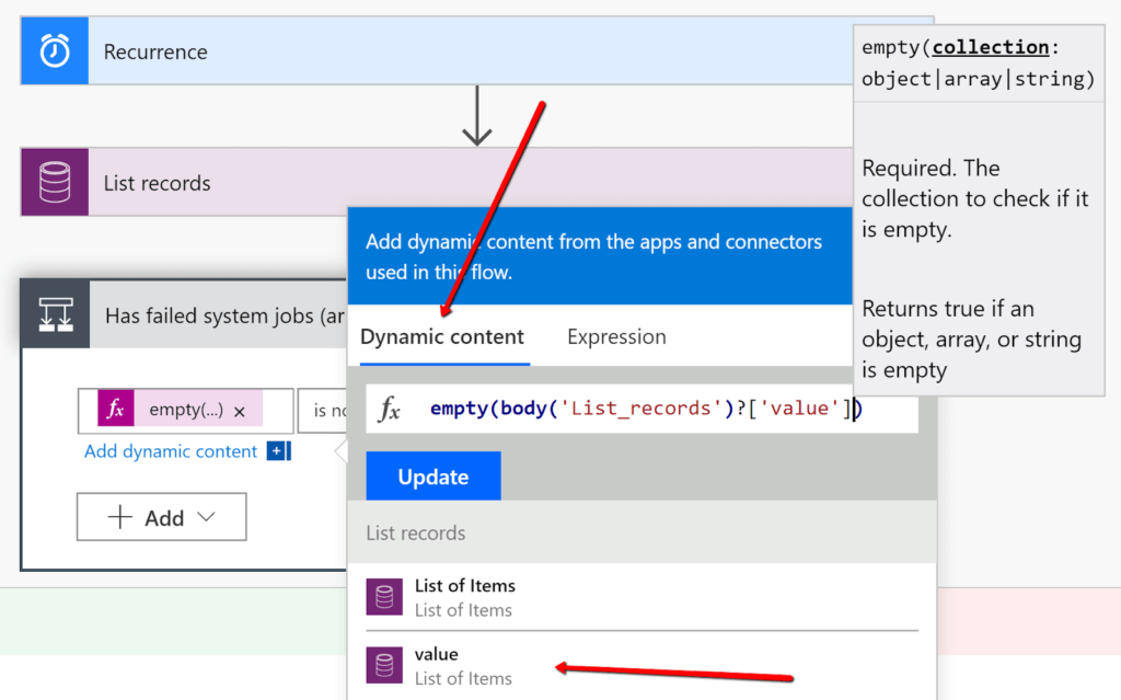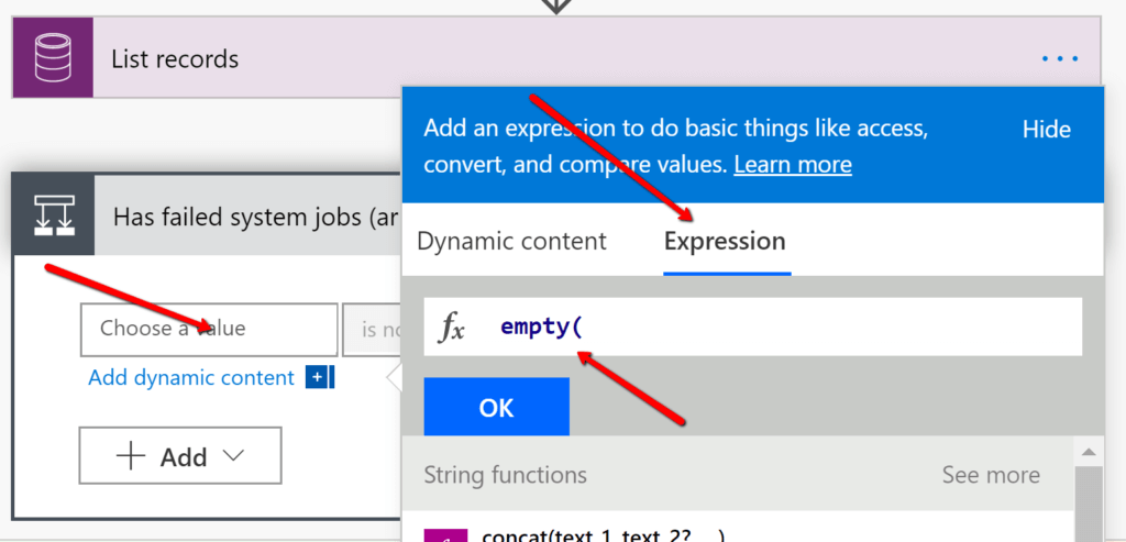 Click“Choose a value” in the first field then in the pop-up go to the Expression menu and start building your function. Click on “Empty” then open, and then go back to the dynamic value and insert the value of our “List of items”.