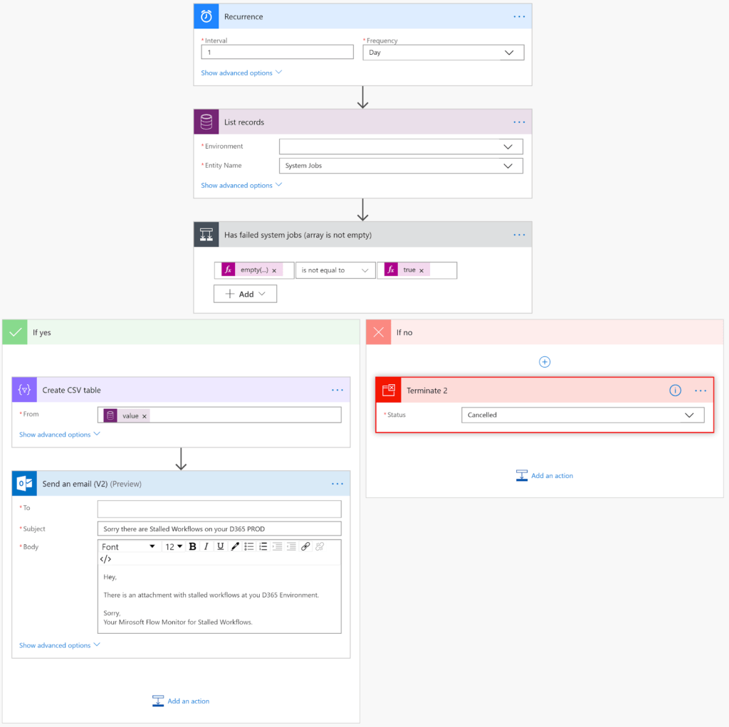 10. If we don’t have any failed or waiting system jobs we can just exit or cancel the flow and not send any messages. And if there is at least one record with a failed or waiting system job, we will receive an email alert with a CSV file attached containing all the details.