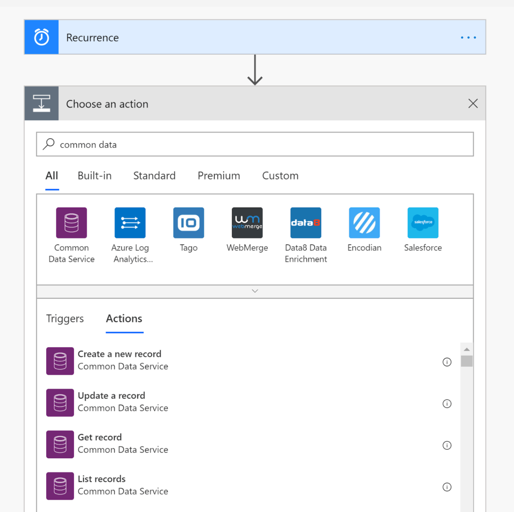 To add a CDS operation I need to filter content. To do this, I type “common data service” and the system then shows me the actions available through CDS. In this case, I want to get a List of Records, so I simply select “List records”.