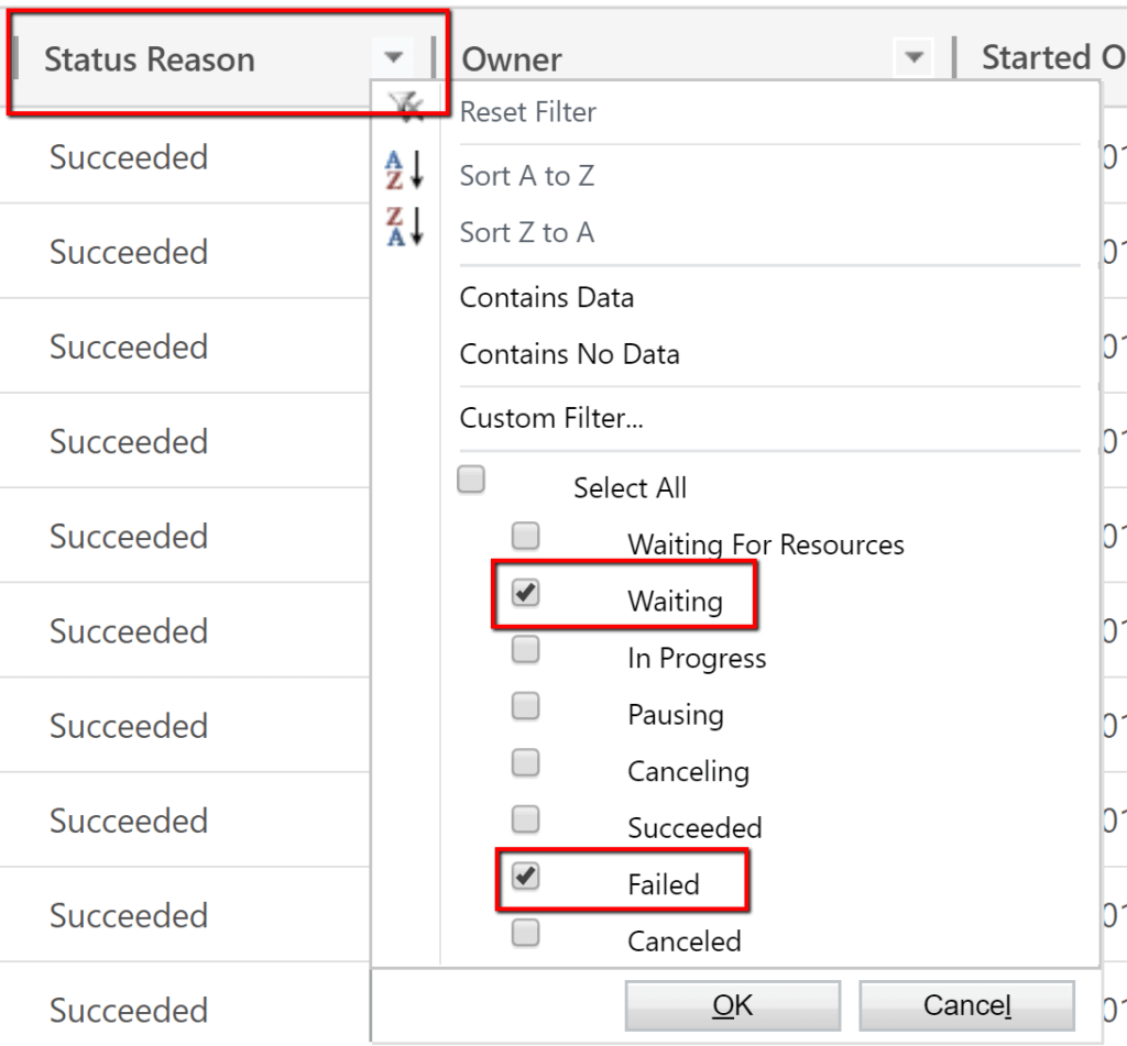 7. I don’t want to get all the system job runs as there are thousands of them, and I only want to track failed ones. To do this, I set the Status Reason to “Waiting” and “Failed”.