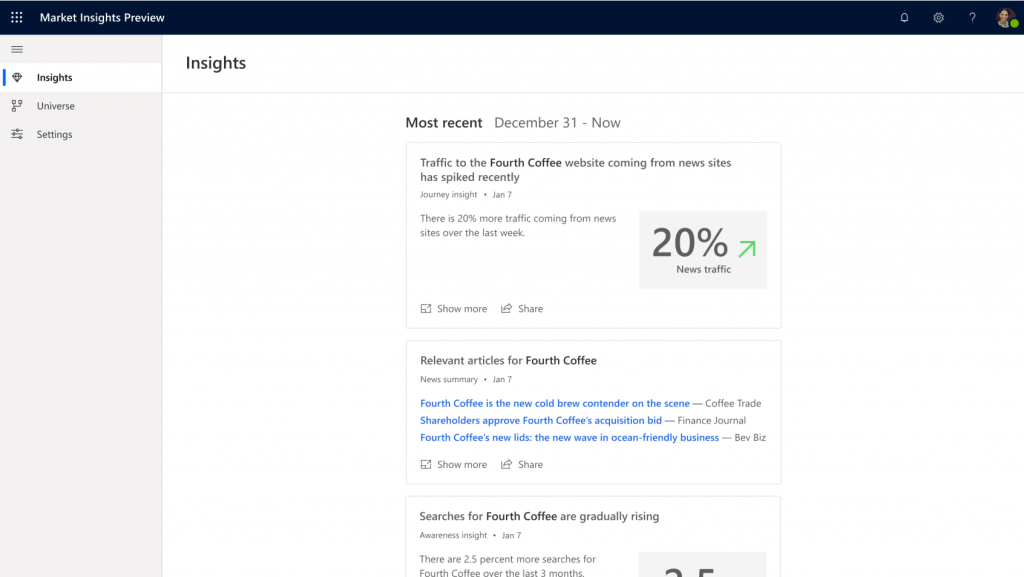 Lots of people used Microsoft Social Engagement because it came free with their Dynamics 365 plan. It could also be purchased on its own, though most who don’t invest in Microsoft tools for CRM prefer alternative options for social listening. The real benefit of Dynamics 365 and its array of related technologies is integrating insights and action. Customers would prefer a tool that provides helpful insights for social and web activities, which is what Market Insights is designed to do.